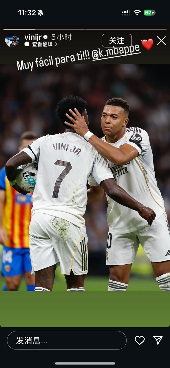 雷速体育11月2日讯 西甲第11轮,皇马4-0战胜瓦伦西亚。 本场比赛皇马获得两次点球机会,第一球姆巴佩主罚命中,第二球维尼修斯主罚被扑出。赛后维尼修斯晒出与姆巴佩拥抱的合照,配文:“对你来说很容易@姆巴佩”,并配上爱心的Emoji。 |