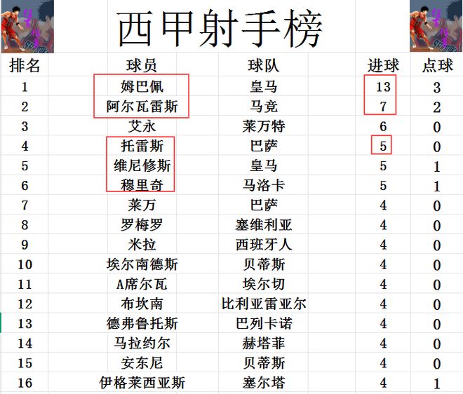 射手榜方面,姆巴佩气势如虹,13球高居榜首,阿尔瓦雷斯落后姆巴佩6球排在第2,艾永6球排在第3。托雷斯今天打入一球,追上维尼修斯和穆里奇,三人5球并列第4。莱万,安东尼,马拉约尔,A席尔瓦等人4球刚好挤入前十。 |