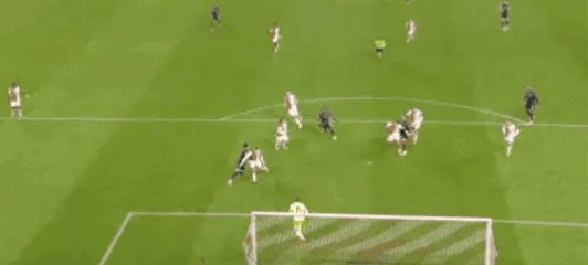 第32分钟,场上僵局被打破:普罗沃德禁区内手球送点,萨卡主罚命中,阿森纳1-0领先,萨卡成为阿森纳欧冠改制后首位连续四场客场破门的球员。