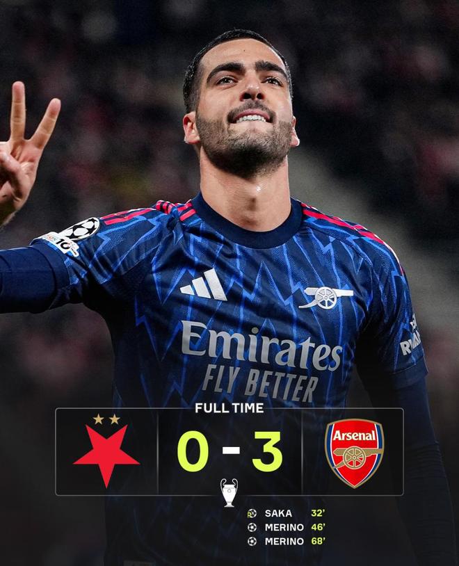 第68分钟,斯拉维亚门将马尔科维奇出现低级失误,皮球直接被梅里诺断下,后者推射空门得手,阿森纳3-0遥遥领先;梅里诺梅开二度,枪手基本锁定胜局,最终比分也定格在此,本场枪手获胜手,创下了几大纪录: 其一,欧冠前四战全胜+全零封,英格兰史上仅第二队,上一次英格兰球队做到这点,还是 1969-70 赛季的利兹联。55年后,阿森纳成为欧冠改制后的第一支英超球队,阿尔特塔的恩帅瓜迪奥拉都未曾做到过。 其二,梅里诺35秒闪击,改写队史欧冠纪录,他的进球刷新了阿森纳在欧冠中下半场最快进球纪录。 其三,防守强到离谱,杯赛6场全零封,枪手已经连续8场零封、十连胜,防线稳如铁壁,前16场正式比赛只丢3球,这数据放眼全欧洲都属于变态级别,拜仁的16连胜都比不了啊。