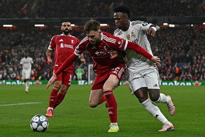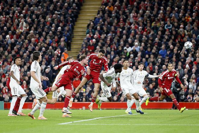 姆巴佩被防得很难受。 皇马感受到英超强度 利物浦活过来了,皇马也从一场强强对话中发现,击败巴萨、领跑西甲并不值得炫耀,要想收获一个成功的赛季,他们的路还长。 贝林厄姆赛后表示:“我认为对手占据了一些优势,尤其在下半时,我们防守不太好,对手获得了许多自由射门的机会,我们想尝试强行去完成一些事情,但比赛最后阶段,我们失去了很多次球权,我们没有带起进攻的势头。” 足球比赛中向来此消彼长,两周前皇马能利用巴萨羸弱的防守创造出大量机会,这一回在安菲尔德的铜墙铁壁前,他们攻防两端都乏善可陈。 亨利在节目中谈到维尼修斯的选择存在问题,“我看到他在一对一面对布拉德利时把球传了出去,回头却尝试一个人攻击对方三名球员组成的防线,这让我看不懂。”