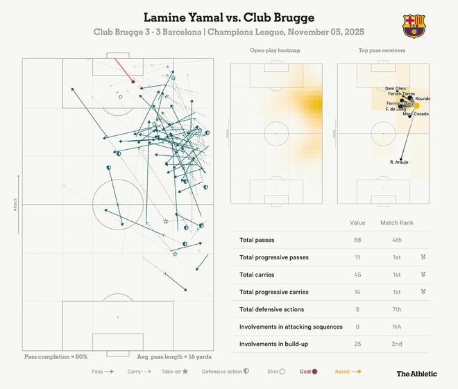 几分钟内,布鲁日便再度领先,因此加泰罗尼亚人需要他们的少年巨星再次挺身而出。一次在禁区右侧的弧线射门迫使杰克尔斯飞身扑救,随后又一记传中导致布鲁日边锋措利斯将球挡入自家网窝。这对希腊国脚和他的球队来说很不走运,但亚马尔配得上一些运气,因为他是本场比赛球队中表现最出色的球员,优势明显。