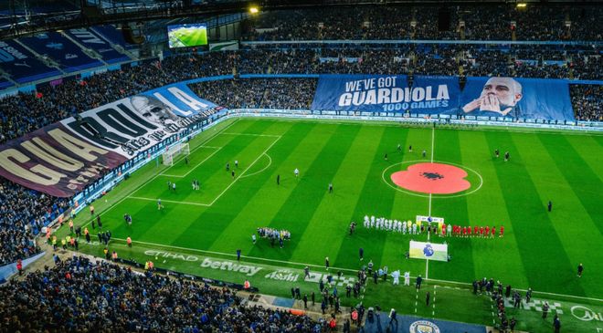值得一提的是,本场比赛正是瓜迪奥拉执教生涯的第1000场比赛,阿提哈德球场摆起了巨大的TIFO,干向瓜迪奥拉致敬。 开场之后,曼城的攻势很猛,持续冲击利物浦的后防线,不到10分钟获得点球资格。