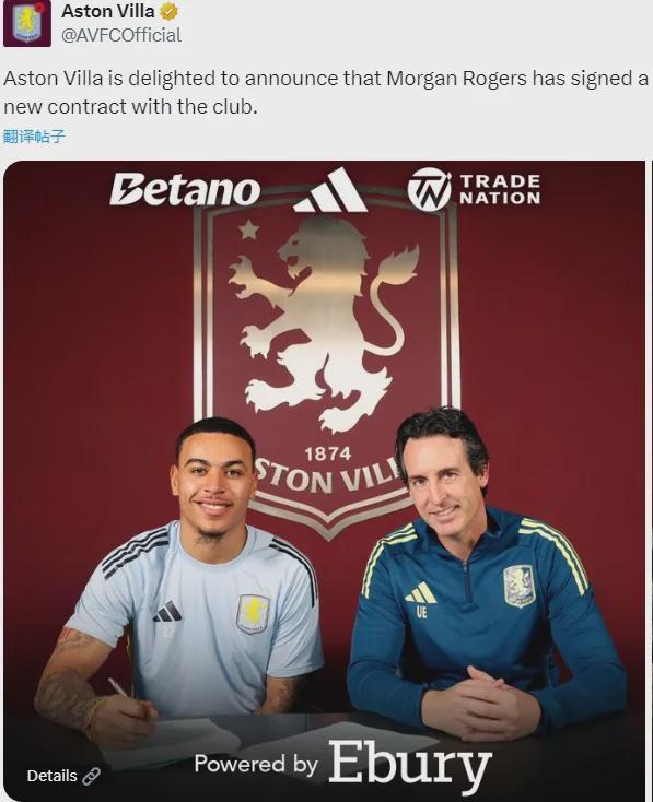 官方:维拉宣布摩根-罗杰斯签下了一份2031年到期的新合同,比原合同延长了一年。 罗杰斯在2024年2月从米德尔斯堡以1600万英镑的价格加盟了维拉,并且迅速在埃梅里手下成长为了球队的关键球员。