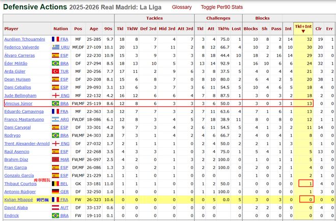 另外还有一个数据,就是姆巴佩本赛季西甲前11轮踢完后,他的抢断和拦截数据依旧是0。要知道哪怕是皇马的门将库尔图瓦,都比姆巴佩多贡献了1次抢断。皇马全队只有3人攻防数据贡献为0,其他两位是出场54分钟的阿拉巴和出场不到10分钟的恩德里克。 虽然说姆巴佩是皇马的头号得分手,你很难指望他将精力投入到防守端,但是他的这个习惯,对于皇马整体战术还是有很大的影响。 别的不说,因为姆巴佩的消极防守,使得韦尼休斯需要更多分心在攻防平衡。本赛季踢了9.6个90分钟的韦尼休斯就贡献了16次抢断+拦截,他在很多时候被当做工兵来用。