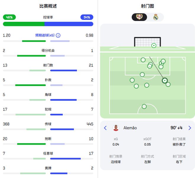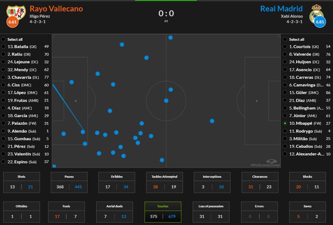 从统计数据可以看到,巴列卡诺的预期进球是1.2比0.98领先皇马,绝佳得分机会也比皇马多1次。 应该说两支球队在场面上是势均力敌的,皇马没有展现出任何的优势。这也跟姆巴佩的接球习惯有关系。他在本场比赛中,一共才在巴列卡诺禁区内触球3次,跟上一场与利物浦比赛时是一样的。 当姆巴佩总是“飘”在外面,对手又防守很强硬,皇马想赢球就很难了。