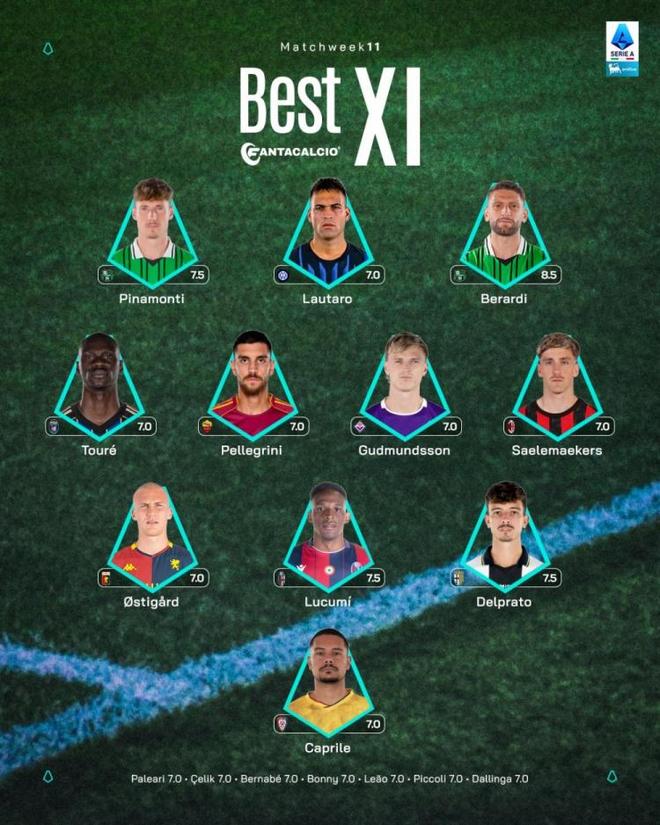意甲官方第11轮最佳阵的: 前锋:皮纳蒙蒂(萨索洛)、劳塔罗(国际米兰)、贝拉尔迪(萨索洛) 中场:伊德里萨·图雷(比萨)、佩莱格里尼(罗马)、阿尔伯特·古德蒙德森(佛罗伦萨)、萨勒马科尔斯(AC米兰) 后卫:厄斯蒂高(热那亚)、卢库米(博洛尼亚)、德尔·普拉托(帕尔马) 门将:卡普里莱(卡利亚里) 消息来源:意甲联赛官方 2 - 阿莱格里称米兰是雏鸡 意甲第11轮比赛,米兰在两球领先的情况被帕尔马将比分扳成2-2。本赛季,米兰出现了遇强不弱遇弱不强的问题。《米兰体育报》盘点了红黑军团的表现主帅不满。