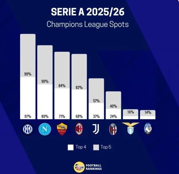 82%丨预测意甲球队闯进前五概率