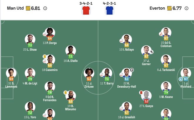 出场阵容 曼联(3421):31-拉门斯;15-约罗,4-德里赫特,23-卢克肖;3-马兹拉维(46‘7-芒特),18-卡塞米罗(58‘37-梅努),8-B费,13-多古(59‘2-达洛特);18-姆伯莫,16-迪亚洛;11-齐尔克泽 埃弗顿(4231):1-皮克福德;23-科尔曼,6-塔尔科夫斯基,5-迈克尔-基恩,16-米科连科;37-加纳,27-盖耶;10-恩迪亚耶,22-霍尔,18-格拉利什;11-巴里 |