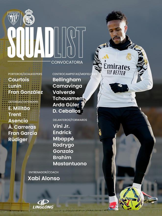 门将:库尔图瓦、卢宁、弗兰-冈萨雷斯 后卫:米利唐、亚历山大-阿诺德、劳尔-阿森西奥、阿尔瓦罗-卡雷拉斯、弗兰-加西亚、吕迪格 中场:贝林厄姆、卡马文加、巴尔韦德、楚阿梅尼、居莱尔、塞瓦略斯 前锋:维尼修斯、恩德里克、姆巴佩、罗德里戈、贡萨洛-加西亚、卜拉欣-迪亚斯、马斯坦托诺 |
