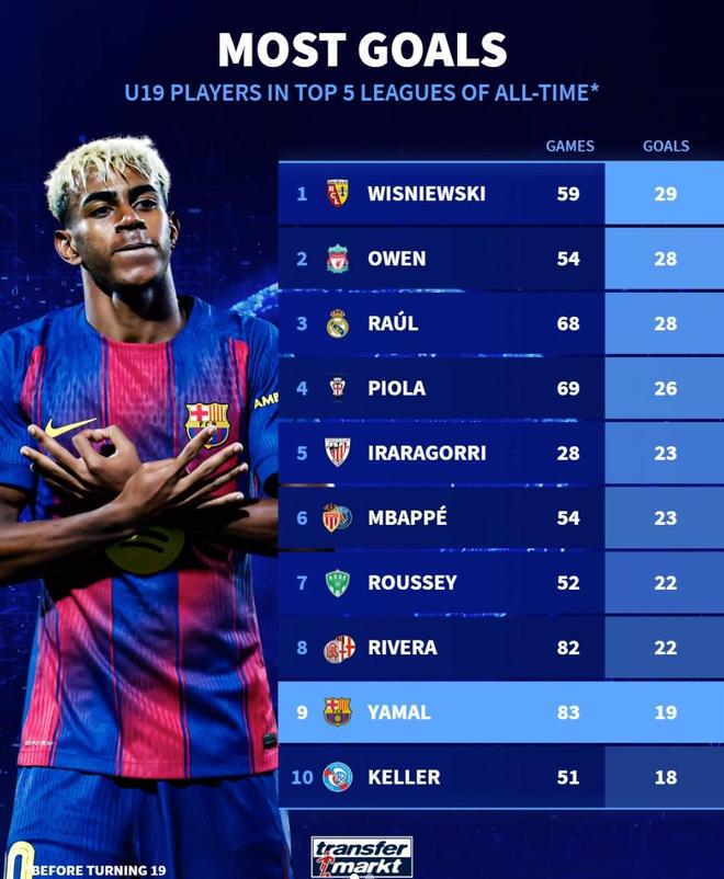 北京时间12月2日,德转统计出了欧洲五大联赛历史U19球员的进球榜,迈克尔-欧文54场打进28球排名第二,劳尔68场打进28球排名第三,此外姆巴佩和亚马尔也都榜上有名。