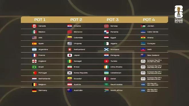 48支球队分为四档,最终各自落位到12个小组,每组内最多包含两支欧洲球队,其余则是同大洲回避原则。一档球队中除了美加墨三个东道主外,还包括西班牙、阿根廷、法国、英格兰、巴西、葡萄牙、荷兰、比利时和德国,二档中包含四支亚洲球队,分别是日本、韩国、伊朗和澳大利亚,三档中最为强悍的肯定是挪威,也是死亡之组的缔造者。四档球队中欧洲区附加赛晋级的球队,实力算是最强的,大概率会有意大利。
