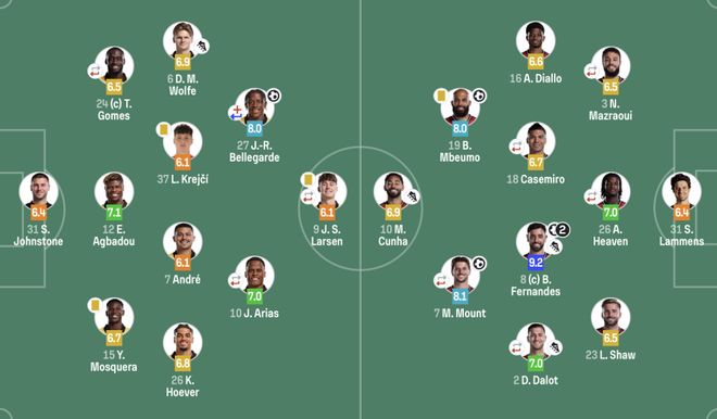 出场阵容 曼联(3421):31-拉门斯;3-马兹拉维(69’6-利马),26-海文(69’15-约罗),23-卢克肖;16-迪亚洛,18-卡塞米罗(78’37-梅努),8-B费,2-达洛特(85’13-多古);18-姆伯莫,7-芒特(85’11-齐尔克泽);10-库尼亚 狼队(3421):31-约翰斯通;15-莫斯奎拉,12-阿格邦杜,24-戈麦斯;26-霍福尔,7-安德烈,37-克雷伊奇,6-沃尔费;10-阿里亚斯,27-贝莱加德;9-拉尔森 |