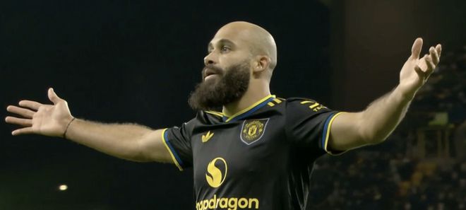 第25分钟,迪亚洛前场抢断,库尼亚助攻,B费倒地后转身铲射入网,1-0!曼联取得领先。