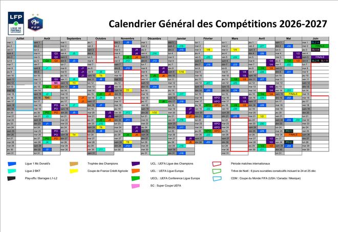 2026-2027赛季法甲联赛将于2026年8月23日那个周末拉开帷幕(第1轮),并在2027年5月29日(周六)进行第34轮比赛后落下帷幕。 2027年1月底,18支球队将结束上半程比赛(1月24日的那个周末),并开始下半程争夺(1月31日的那个周末)。本赛季没有任何一轮比赛会在周中进行。 法甲/法乙升级附加赛首回合(法乙升级附加赛冠军/法甲第16名):2027年6月3日(周四) 法甲/法乙升级附加赛次回合(法甲第16名/法乙升级附加赛冠军):2027年6月6日(周日) |