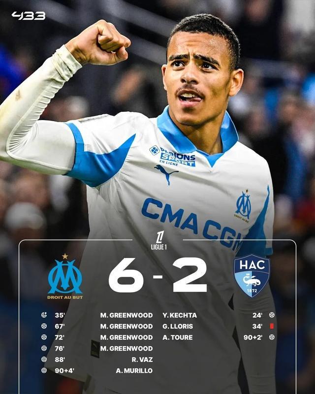 法甲第8轮比赛,格林伍德用一场载入史册的表演:单场狂轰四粒进球,帮助马赛在主场6-2血洗勒阿弗尔。在罗伯托·德泽尔比的带领下,马赛以1分优势力压巴黎圣日耳曼,登上法甲榜首...